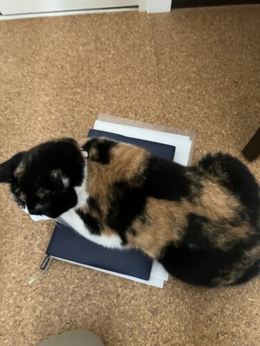 人見知りしない猫ちゃんがいらっしゃるお宅で近づいてきたと思ったら、私の手帳の上に堂々と「よいしょっ」