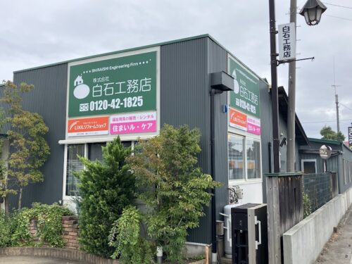 3つの看板 「株式会社白石工務店」「LIXILリフォームショップ白石工務店」「住まいル・ケア」を掲げました
